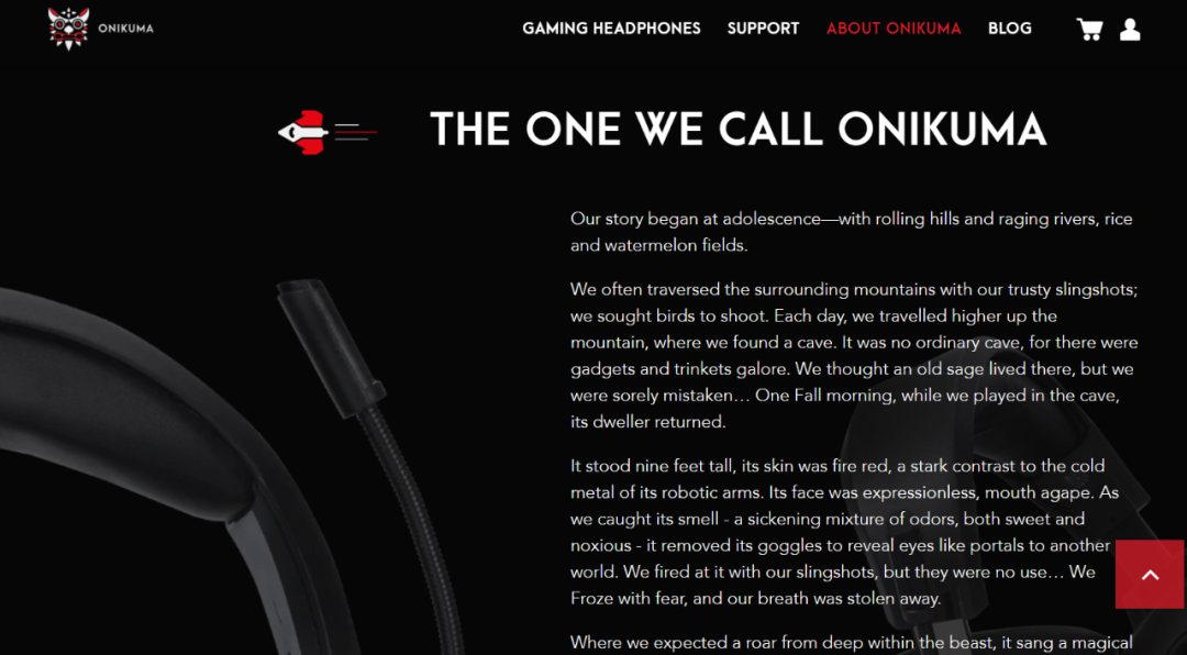 我们经常带着弹弓横穿周围的山脉去射击小鸟。每天,我们都要上山,在山上我们发现了一个山洞,但那不是普通的山洞,我们在洞里发现了许多小玩意和小饰品。一开始,我们以为那里住着一个老圣人,后来我们发现我们错了——在一个秋天的早晨,当我们像以往一样在山洞里玩耍时,它回来了。它高9英尺,皮肤是火红色,与冷金属的机械臂的形成了鲜明的对比。它面无表情,但嘴巴却瞪着。我们还闻到了它的气味——是一种令人恶心的混合气味,既甜腻又像有剧毒。之后它摘下了它的护目镜,露出了一双仿佛能通往另一个世界的眼睛。我们用弹弓向它开火,但是没有用……因为害怕和恐惧,我们都僵立在了那里,不敢呼吸。我们以为它会像野兽一样对我们咆哮,但是它却唱起了一首神秘的歌。它的吟唱像雷声一样,回荡在山腰。我们捂住耳朵跑了,随着歌曲的渐强,我们感觉震耳欲聋。我们跑了很久,远离了洞穴,也完全看不见它了。当时我们并不知道这件事会影响我们的一生。每当我们回想起它的眼睛时,它的歌声就会出现在我们的脑海,不停地吟唱着一首民谣,唱着关于Onikuma的故事。当我们回到山下时,我们的听力又恢复了,慢慢地,世界又变得充满了声音。我们第一次听到了这个世界的声音。以前怎么没有注意到?汹涌的河水声,鸟儿的叫声和积雪的融化声都在我们的耳边环绕,向我们传递了一个清晰的信息:一个叫Onikuma的人希望所有人都能听到这个世界的美丽。从那一天开始,我们一直努力分享世界各地的歌曲。用敏锐的耳朵和热切的心创造了Onikuma 品牌。我们知道这不是普通的故事,但是如果没有Onikuma唤醒我们,我们也无法与世界分享我们的一切。因此,每当您使用我们的产品时,希望您都能想到那个神秘的Onikuma,拥有它的神秘力量,游戏如入魔。(注释:在西方文化里入魔,被魔力附身是一件好事,代表了力量和能力)品牌故事是对品牌的一个诠释。它介绍了品牌的由来,包含了人、情感和产品的三要素,确定了一个品牌的调性。虽然只是一个故事,但是它能加强品牌建设,能帮助品牌获取更强大的传播力,能拉近品牌与消费者之间的距离,树立品牌的独特信仰。