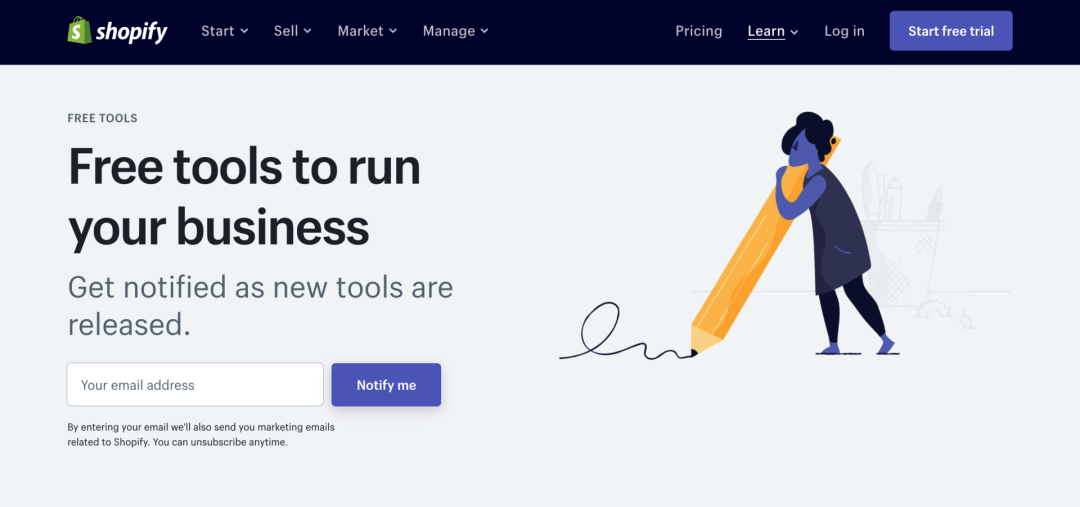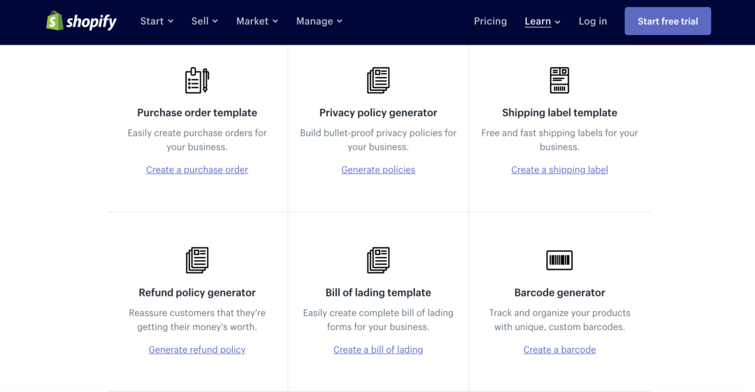 Shopify Tools是一个涵盖各类官方工具的网站,例如:企业名称生成器、品牌标语生成器、二维码生成器和各类条款(隐私条款、退换货条款)模版等。即刻提高你的生产力!