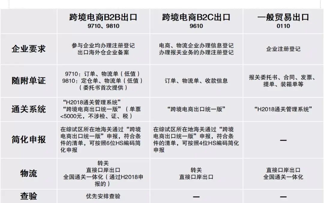 关于跨境电商B2B出口 跨境电商B2B出口是指境内企业通过跨境物流将货物运送至境外企业或海外仓,并通过跨境电商平台完成交易的贸易形式。主要包括两种类型: 四种监管类型比较 B2B直接出口模式企业资质要求 ✔境内企业且参与跨境电商B2B出口业务。包括: 跨境电商企业 受跨境电商企业委托的代理报关企业 自营平台 第三方平台 境内平台 境外平台 向所在地海关办理企业注册登记,在跨境电商企业类型中勾选相应企业类型。 已办理注册登记未勾选企业类型的,在国际贸易“单一窗口”提交注册信息变更申请。 通过“跨境电商出口统一版”系统申报清单的,物流企业应获得国家邮政管理部门颁发的《快递经营许可证》。 出口海外仓业务模式企业资质要求 ✔开展跨境电商出口海外仓业务的境内企业应在海关办理注册登记,且企业信用等级为一般信用及以上。 出口海外仓业务模式备案资料要求 跨境电商B2B出口企业申报流程 企业通过“国际贸易‘单一窗口’标准版”或“互联网+海关”的跨境电商通关服务系统和货物申报系统,向海关提交申报数据、传输电子信息。 便利措施 01 注册登记便利 跨境电商企业、跨境电商平台企业、物流企业等参与跨境电商B2B出口业务的境内企业,依据海关企管部门相关规定,向所在地海关办理注册登记,在“跨境电商企业类型”中勾选相应的企业类型。同时可办理出口海外仓业务模式备案。 已办理注册登记未勾选企业类型的,可以在国际贸易“单一窗口”提交注册信息变更申请。 02 通关便利 跨境电商B2B出口单票金额在5000元人民币以下且不涉证、不涉检、不涉税的货物,企业可以报送申报清单,系统校验通过后自动推送至“跨境电商出口统一版系统”以申报清单的方式通关,无需汇总申报报关单。申报要素减少57项,让中小微出口企业申报更为便捷。 03 综试区简化申报 在跨境电商综试区所在地海关通过“跨境电商出口统一版系统”申报9710、9810,不涉及出口退税的,可按照6位HS编码简化申报。 在跨境电商综试区所在地海关通过“跨境电商出口统一版系统”申报的,可将货物品名以总运单形式按“跨境电商商品一批”录入。 04 查验便利 针对跨境电商货物通关时效要求高的特点,现场海关对跨境电商B2B出口货物优先安排查验。 05 暑期培训注意事项 B2B出口模式可以实现批量出货,解决了跨境电商企业必须在出口前单个打包并逐个黏贴面单的问题,降低了出口前人工操作和物流成本。 跨境电商B2B出口货物可按照“跨境电商”类型办理转关。通过“H2018通关管理系统”通关的,同样适用全国通关一体化。企业可以根据自身实际选择时效更强、组合更优的方式运送货物。 06 退货便利 对跨境电商出口海外仓货物1年内退运进境的,海关建立底账数据形式进行管理。 《跨境电子商务B2B出口监管试点名单》