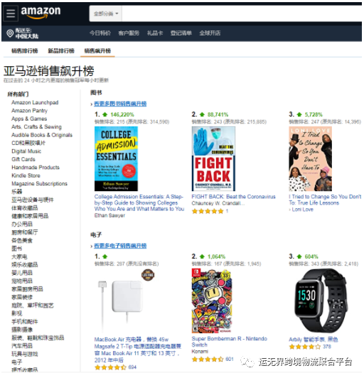 这个榜单包含24小时销量排行榜、24小时最猛人气排行榜、24小时收藏排行榜。特别是Movers&Shakers,这个榜单上包含了亚马逊各个类目中过去24小时内排名变动最大的100款产品:在这个榜单上都会有一个绿色的箭头,代表着产品的人气正在上升,同时,箭头的旁边会显示出产品人气的上升指数。箭头的下方,卖家可以看到该产品在BSR中的排名。