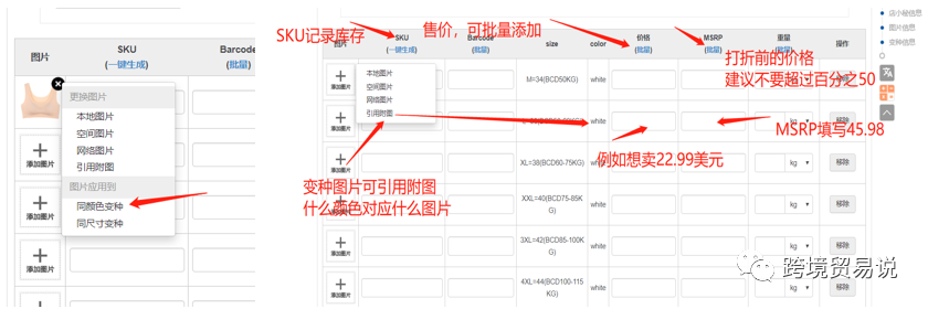变种图片可用附图,上传完成后,可以使用同颜色或者同尺寸的变种,不用再一张一张上传,也可自己添加其他图片,SKU可以自己编辑,记录库存,售价如果一致,可以批量添加,MSRP打折前的价格,重量不填