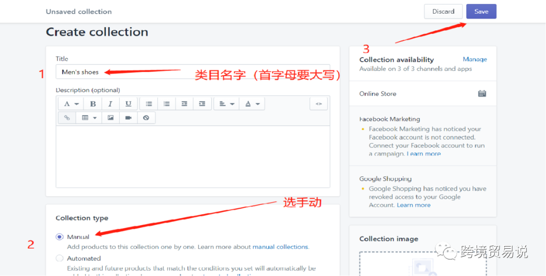 创建一级二级类目,列如,男鞋,属于一级类目,男鞋里面包括运动鞋,皮鞋等属于二级类目,在Collection type(收集类型)选择Manual(手动收集)点击保存,一级类目和二级类目同样的创建办法,创建完成之后,再进行分类。