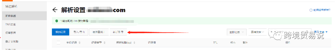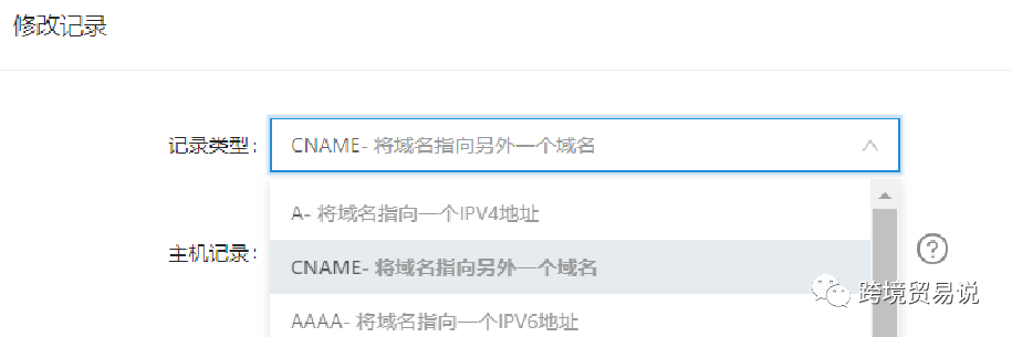 解析完成后,更改A记录内容,记录类型更改,指向另外一个域名,记录值shops.myshopify.com