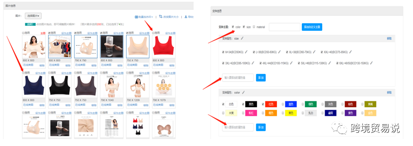 (4)选一张好看的图片当首图,其他图片和里面选择颜色展示和尺码,还有功能展示,记得勾选才能展示出来。