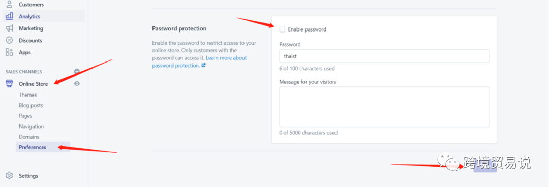 付款成功后,点击网上商城,点击Preferences(优先)找到Password protection(密码保护)去掉勾选,点击保存,这样就可以看到自己的上传的产品。