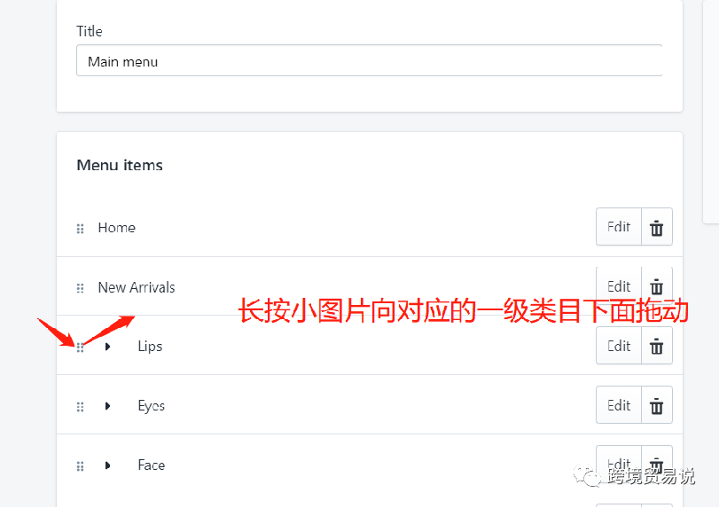 先编辑类目主菜单,点击Main Menu,点击添加ADD,进行类目整合,名字填写刚才创建的一级二级类目,比如Lips(嘴唇)Link选择对应的Lips,点击保存,继续添加创建的所有类目名字。