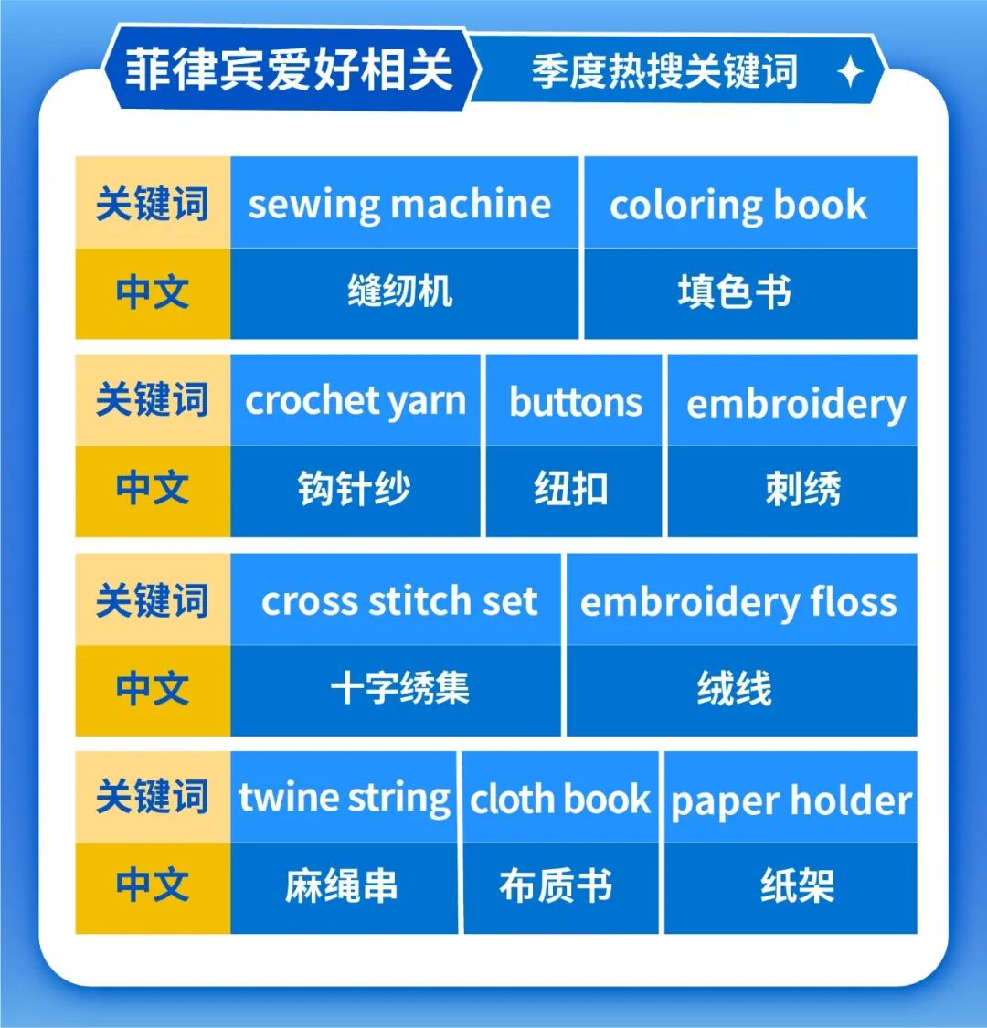 返校季终于来了,家里的小祖宗总算是不用在家嗷嗷叫唤,给妈妈们留下不少清净时光。至于该如何好好利用上这些难得的空闲,菲律宾妈妈们给出了好答案——先学下缝纫和编织!近期在菲律宾站点,缝纫、编织和刺绣相关的关键词,在兴趣及文具这一类目下,飙升迅猛,这类关键词能低投入撬动大流量,相关卖家不妨可以尝试尝试下手。