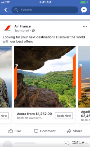轮播广告可以出现在Facebook上的六个不同位置:Facebook动态消息、右边栏、即阅文,Facebook 平台,Facebook受众网络和Facebook Messenger。但是所有轮播格式都使用类似的图像和视频规范。