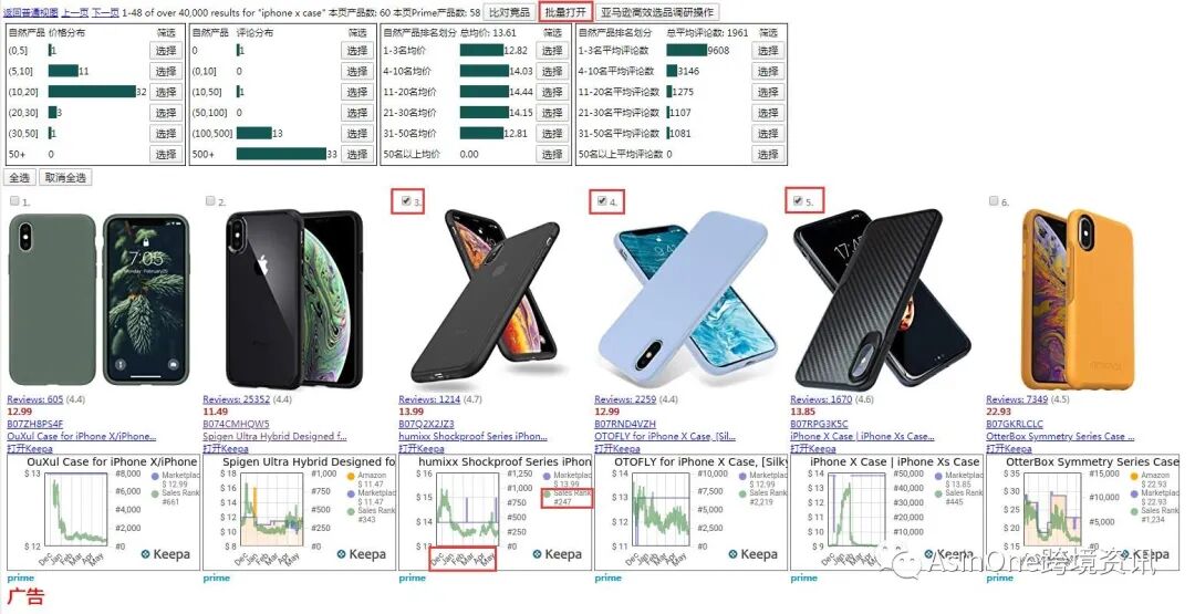 2.点书签的[打开页面统计]按钮,即可显示本页总体价格排名统计情况,同时每个ASIN下面会有keepa走势图,同时,可以自主勾选ASIN进行下一步操作,比如勾选一些上架时间短,排名比较好的产品来进行下一步操作,如图: