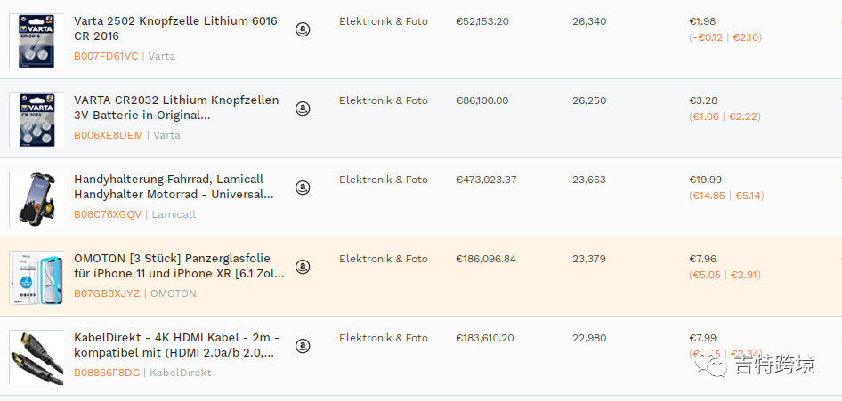 在亚马逊的大多数站点中,电子产品一直都是销售热门类目,瑞典站当然也不例外,根据亚马逊其他欧洲站点的销售数据可以看出:便携备用电池、数据线、手机支架等产品销量均较高,都可以作为考虑范畴