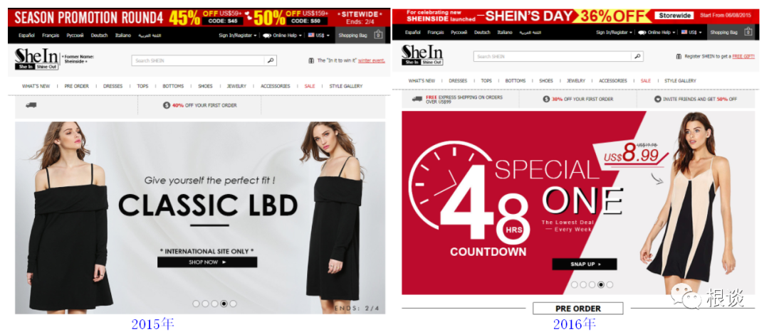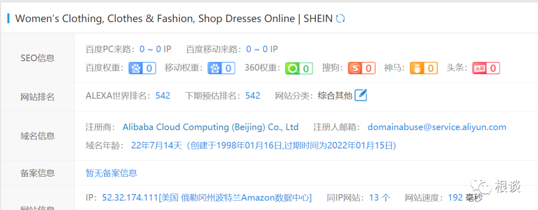 Shein.com前身是Sheinside.com,通过whois的查询来看注册于2011年,但是Shein.com这个域名首次注册于1998年,说明可能是在2015年左右从别人手上及时购买的,有消息说是花了一百多万RMB,无从可考,但是SHEIN确实简单好记,发音顺口,符合一个好的品牌应该有的名字,顾名思义,听起来就像一个女性时尚的品牌,唯一的缺点可能后期延伸男装产品线有一定的难度。这因此SHEIN的定位一直在时尚上面,没有像其他国内同行一样做成服饰电子综合平台类的站点,导致后期方向和用户画像不清晰。