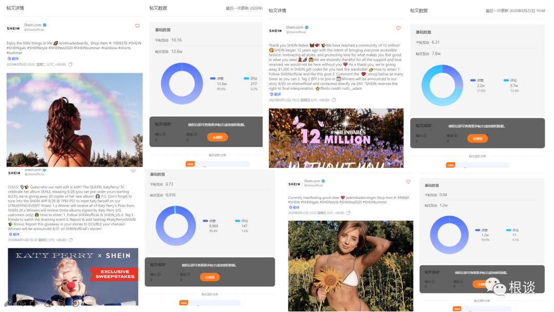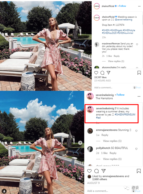 SHEIN帖子以网红图为主,通过给网红寄送衣服合作的形式获得网红图,同时网红会艾特SHEIN官号,SHEIN官号引用网红图也会艾特对方,实现品牌和红人之间的互动,达到互相引粉的双赢局面。