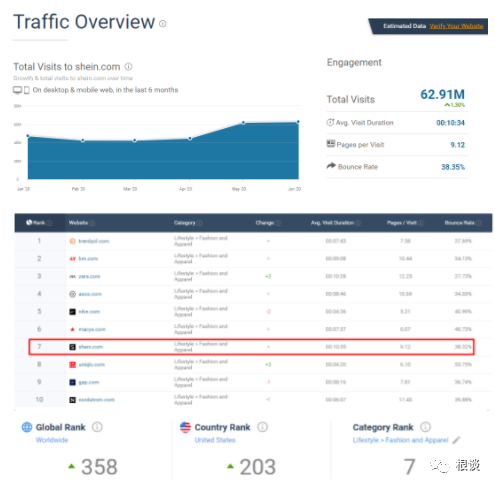 通过Similarweb的数据(2020年7月份)来看,网站月均流量在6千万(应该是PV),其中UV至少有4千万以上,意味着每天至少有100万的独立访客来网站。SHEIN全球排名358(Aleax :544),时装分类排名第7,排在优衣库和GAP的前面,互联网后浪有追赶前浪的趋势;网站跳出率不到40%,其中网站停留时间10分钟左右,平均每个访客浏览页面9个,间接可以说明其网站的内容吸引度和丰富度,由于SHEIN有快速上新的优势,海量的SKU让用户来SHEIN有点像逛街一样寻找时尚趋势和灵感,流量精准的情况下跳出率肯定很低。