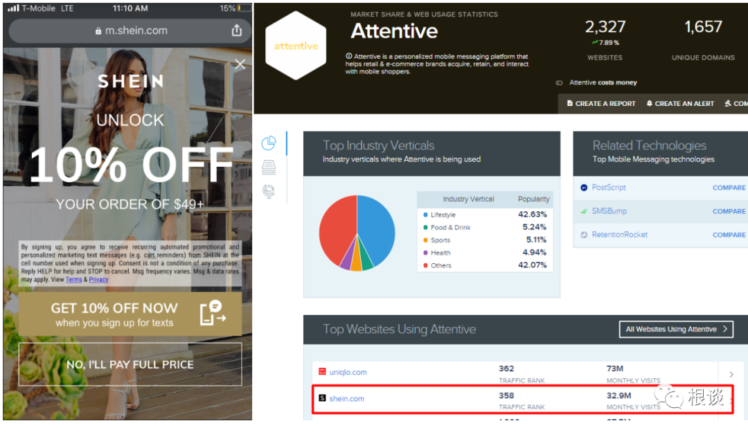 SHEIN通过与Attentive合作,在登陆页面做了一个收集用户手机号码用户发送营销短信,通过送折扣的方式引导用户去订阅短信,名义上是做购物提醒,实际上在黒五网一等大型购物节,通过发送海量促销短信,达到提高复购率的目的。