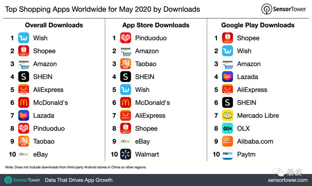 把所有用户装进一个APP是每个商家的梦想,随着移动互联网的普及以及智能手机的发展,整个互联网移动化趋势越来越明显。从公开资料来看,SHEIN也是很早就早布局移动端的。另外由于APP可以随时触达用户,可以提升用户的生命周期价值,很多品牌独立站都会开发APP,然后通过在广告渠道大量买量。就Sensortower的统计分析SHEIN 5月份在全球购物APP的排名:google play 第6名,APP store 第4名,全部下载榜第4名,且2020年7月份最新数据全球有600万的下载量。