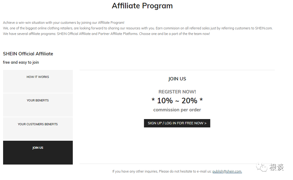 通过联盟营销的方式,鼓励用户或者联盟客推广产品,获得销售额后根据销售额的比例给联盟客返佣,从而获得大量的引荐流量,Shein很早就开始做联盟渠道营销,我们也看到了官网页脚下面留了Affiliate的入口,这样做的好处简单方便联盟客直接找到其项目,而非需要到处去寻找,可以吸引更多潜在联盟客加入由于SHEIN有自营联盟,可以把从官网来的流量其中一部分有赚钱想法的用户或者网红加入成为联盟私域流量的一部分