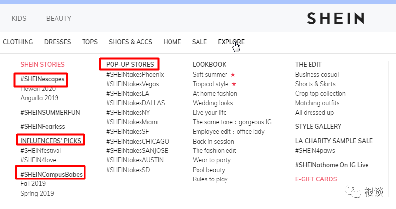 从SHEIN的官网Explore分类可以看到历史做的一些事件营销,包括脱口秀节目The real,出网红联名款,歌手明星kate perry,电影明星Madelaine Petsch,IP联名包括跟海绵宝宝,迪士尼的花木兰等大型IP合作