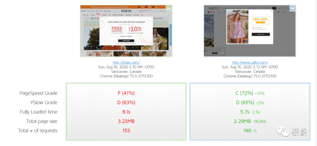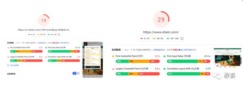 通过第三方的工具使用了加拿服务器大节点检测shein全球站的打开速度,由于SHEIN首页一图片为主,有各种轮播banner大图,CSS样式丰富,JS代码请求数比较多,导致单个页面较大,影响了网站的加载速度,pagespeed实际得分很低,远低于76%的行业平均水平。相比竞品ZAFUL还是优化空间很大,同时对比google的page speed insight桌面和移动端都加载比较慢