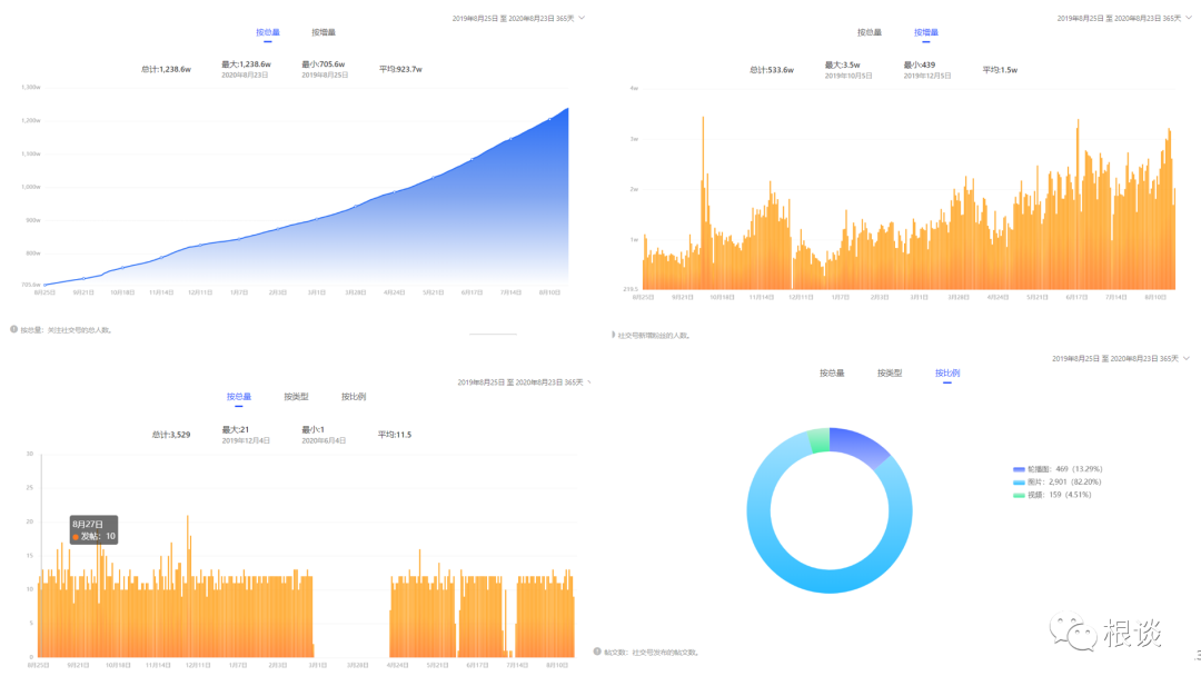 贴文数据来看,帖子类型4%为视频类型,82%为图片,14%为轮播图 ,最多一天发帖13张,最少每天9张,平均每天发帖11张,帖子更新频率很高。
