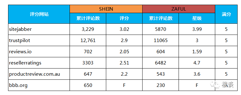 不像亚马逊平台是listing导向,重视买家的评论,独立站可以自己操控每个产品的评论甚至在产品冷启动刷一下评价来提升转化(当然亚马逊有些店铺也存在专门做评论),但是外网第三方点评机构的评分稍微客观。我们找了一下SHEIN外网的真实评分情况。选取了行业比较知名的6个测评站包括Sitejabber,Trustpolot,Reviews,Resellerratings,Productreview,还有BBB,发现整体评分都不太高,其中最高的是Sitejabber的星级给了3.02分,为了方便大家参考,引入体量比她小的竞品ZAFUL,发现站外口碑相比ZAFUL差一些。由于国外用户购物习惯,在第一次在新网站上购物都会在Google上搜索 品牌名称+review/legit,如果评分不高,会影响流量到站内的转化率。
