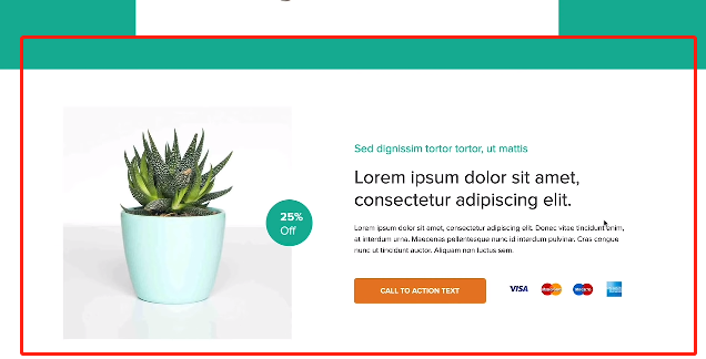 下面例子中的着陆页面中,整体页面颜色是青色,“购物”按钮采用反差色橙色,后方增加Visa等常见的购物付款形式,增加网站的可信度,可以在更大程度上提升点击和付费。