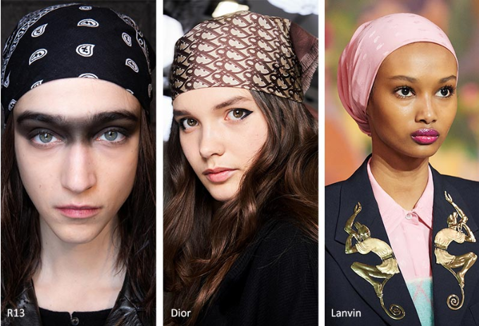 在克里斯汀·迪奥(Christian Dior),模特们穿着绸缎头巾,上面印有该品牌的字母徽标,头饰绑在头上,更加休闲。R13则是采用旧派佩斯利印花的头巾设计。