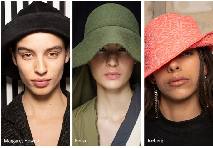 Vivetta在桶形帽子上给人一种女性化的感觉,由粉红色的毡毛制成,结构更加坚固和结构化。Kenzo在桶形帽子方面略有改动,提供了多种不同面料和颜色的桶形帽子,并在背部增加了防护布的长度。Iceberg和Off-White则是设计了柔软的印花水桶帽。