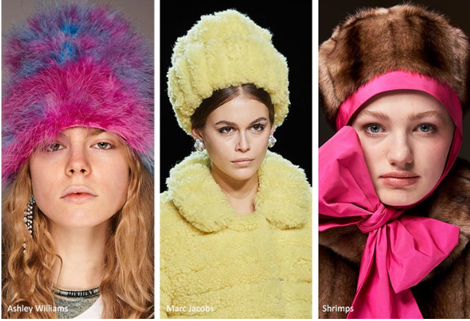 在明亮而有趣的方面,阿什利·威廉姆斯(Ashley Williams)呈现了柔软的帽子和细长的豆豆形帽,它们由羽毛般模糊的人造皮草制成,呈粉红色和蓝色渐变。