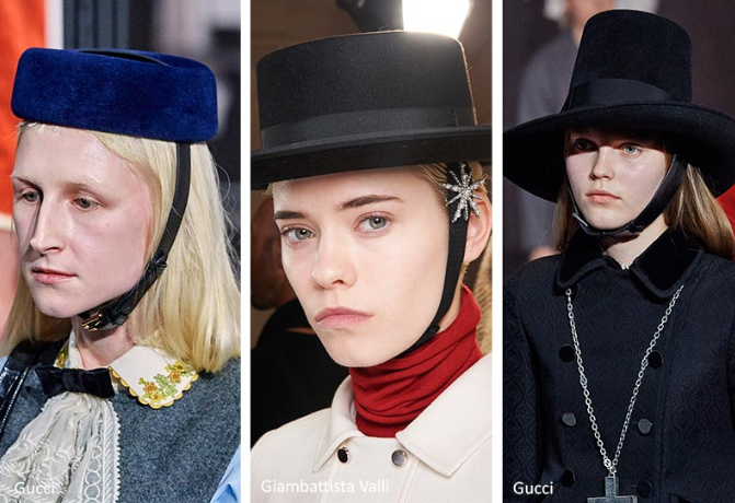 下巴带子在Self-Portrait或Maison Margiela的帽子上看起来像是马术帽的自然添加,但是当加到Gucci的不同款式时,它们看起来特别酷。Giambattista Valli甚至在下巴带上饰有宝石别针。