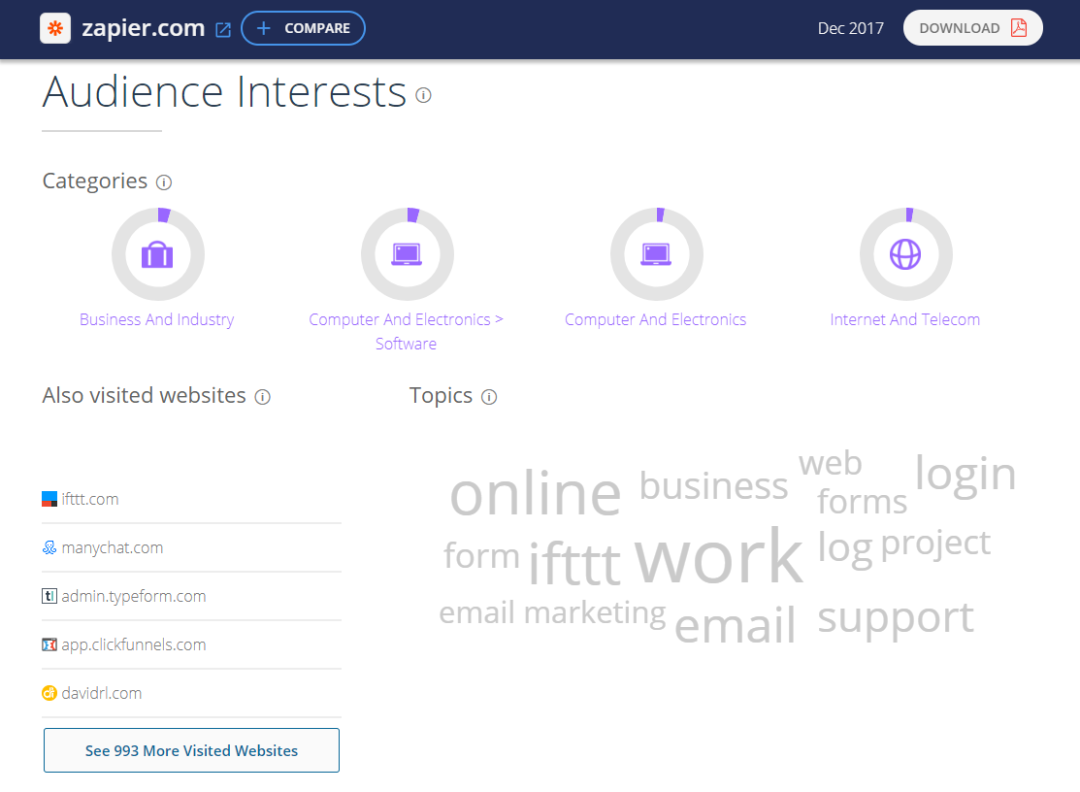 更重要的是,对于内容营销人员来说,可以轻松看到访客搜索的主题是什么,他们还访问了哪些相关网站。