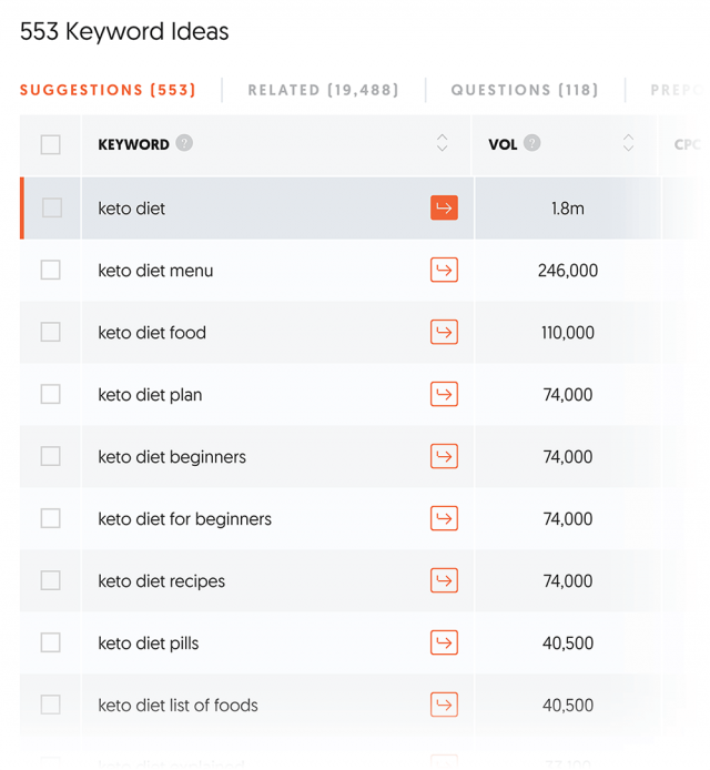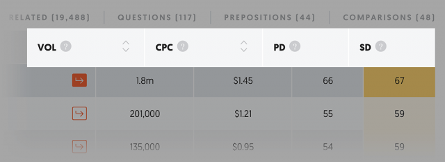 用户输入关键词,UberSuggest可立即展示所有与之相关的长尾词,以及每个关键词和长尾的每月搜索量,平均每次点击费用,PPC竞争和SEO竞争。