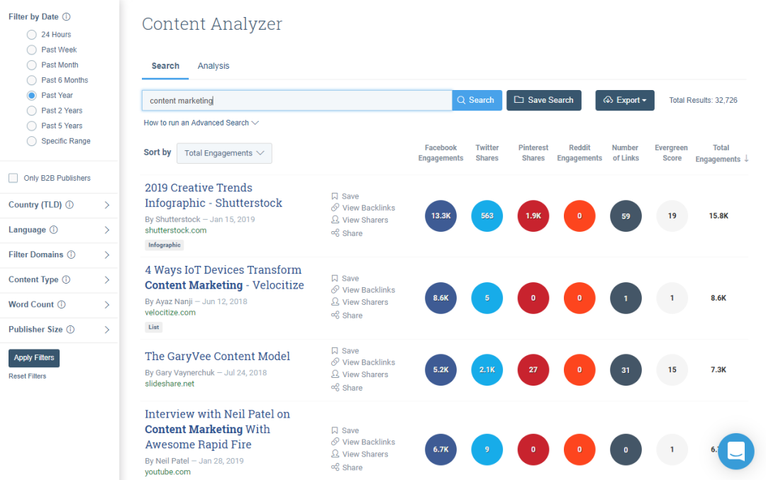 Buzzsumo是一款专注于内容的竞品监测工具。它可以查询任一关键词在社交媒体的热度,帮助内容创作者选题创作。同时,它还允许用户查看自己品牌或竞争对手相关主题下表现最佳的内容,也可以查看目前有多少人正在共享竞争对手的内容。