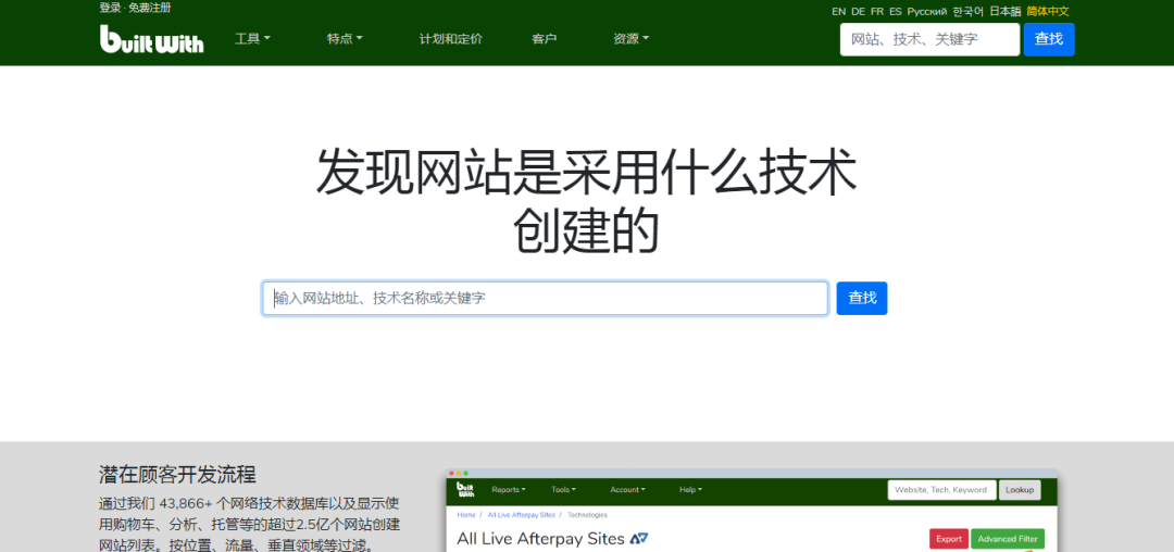 BuiltWith是一个行业分析工具。只要输入竞争对手网站的URL,就会看到网站使用的脚本、服务和插件。除此之外,还可以查询任何网站使用的各种前端和后端技术。