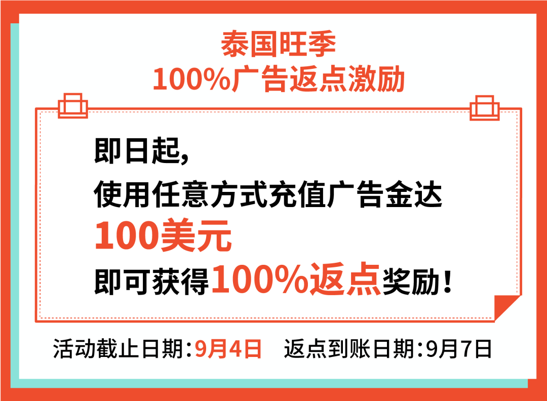 Shopee泰国站点广告金充值“夸张且任性”返点计划登场:即日起至9月4日,Shopee跨境卖家充值100美元以上广告金,即可获得100%返点,真正充多少返多少,9.9大促广告不停步,旺季店铺人流拦不住!