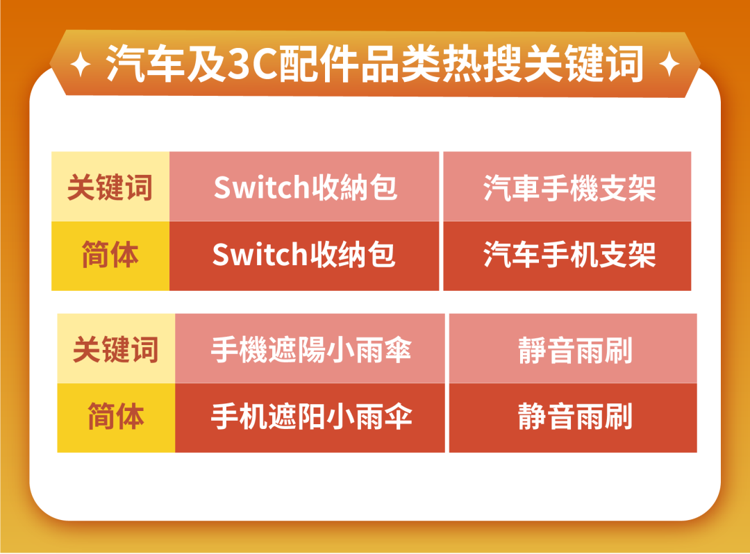 随着户外出行的增加,汽车手机支架、手机遮阳小雨伞等成了汽车车主、机车车主们喜爱购买的配件,可用于提升出行体验,保护手机。且在夏秋交际,雨天间歇降临的时节,卖家可批量降价销售软骨静音雨刷器以吸引车主们剁手。