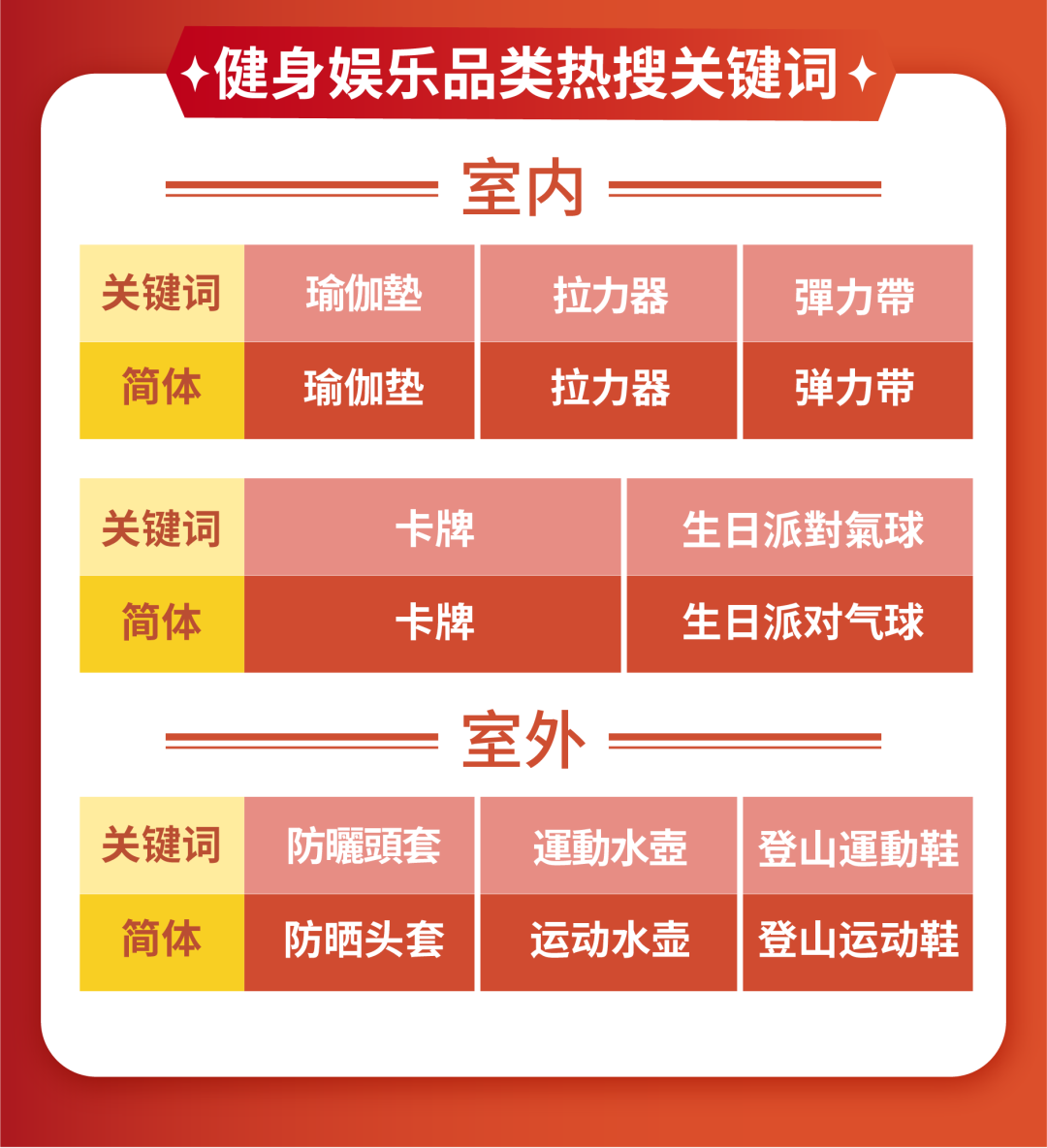 从网络上各种百万播放的健身打卡视频可看出,久居家中的广大宅男宅女意识到健康塑形的重要性,并纷纷行动起来。建议多上新各种居家健身器材,如瑜伽垫、脚蹬拉力器和健身弹力带等,附上燃脂、瘦腹、有氧等关键词,单量更有保证!