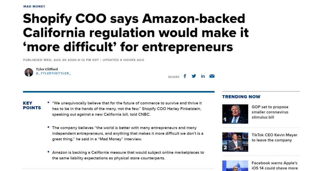 不出意外,在亚马逊宣布赞成为第三方卖家产品质量担责之后,一些电商平台立刻就坐不住了,纷纷站出来反对亚马逊的这一声明,Etsy、Shopify称“亚马逊这是借助法案来消灭竞争对手”,“亚马逊对法案的支持让许多企业更加难做”