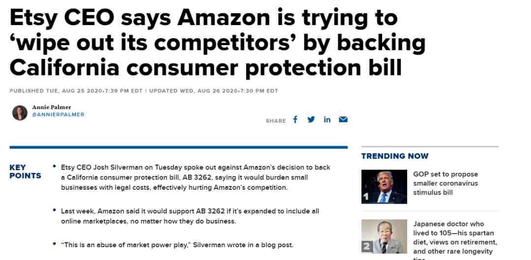 亚马逊如果真的能推动这一法案改动,不说别的,绝对会对Etsy这样的小平台造成巨大的虹吸作用,将小平台的流量吸引到亚马逊上。为包括第三方在内的所有产品负责,让买家可以更加放心大胆地购物,这对买家来说是一个极为诱人的吸引点。