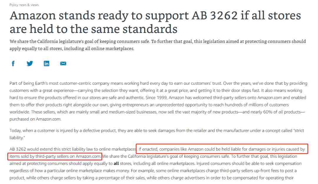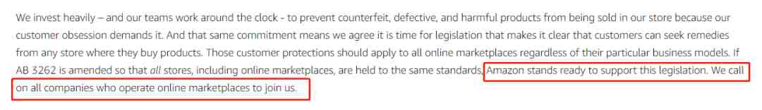 简单翻一下,就是说“如果政府对AB 3262法案(一个规定了零售商和制造商需要对产品质量负责的法案)进行修改,使法案有效范围扩大至线上电商时,亚马逊已经做好准备来迎接这一改动,并且我们呼吁所有运营在线电商平台的公司加入我们。”
