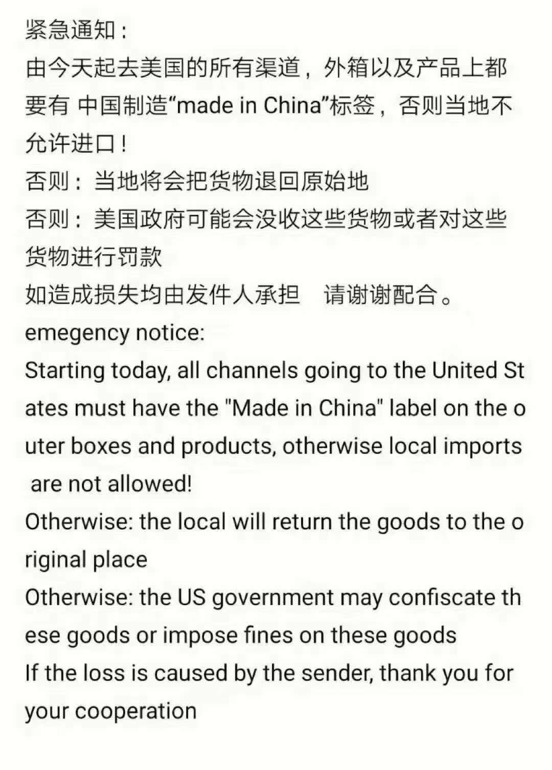 通知显示:由今日起去美国的所有渠道,外箱以及产品上都要有中国制造“Made in China”的标签,否则将会出现以下后果:当地不允许进口;当地将会把货物退回原始地;美国政府可能会没收这些货物或者对这些货物进行罚款。最后,该通知还表明如造成损失均由发件人承担。