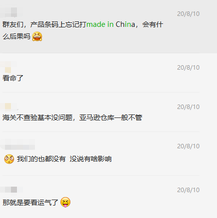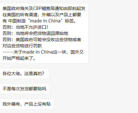 在卖方通卖家交流群中,也有不少卖家收到了货代的这则消息,并表示自己有的产品没有贴“Made in China”标签。