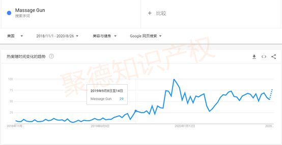 筋膜枪不仅仅在国内火爆,在美国也同样火爆,从去年九月开始,筋膜枪在Google Trends的美国地区的搜索热度一路攀升,去年年底热度一度飙升至100,虽然后面热度有所回落,但也保持着相对稳定的状态。