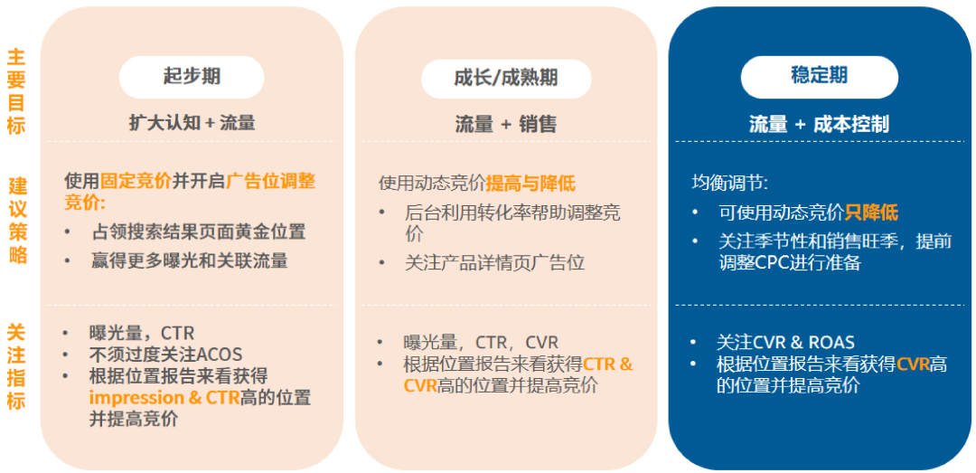 同时通过发现新的潜力ASIN来获得新的销售机会: 1.通过“已购买的商品报告”发现相关未打广告的潜力ASIN。 2.通过查看评论,根据顾客需求进行产品改良、新功能开发、同类产品开发、补充产品开发。 而想要获得新的销售机会?你还可以尝试使用我们一直强推的展!示!型!推!广!功!能! 用过的卖家,都有什么收获? 以上内容为【卖家】意见,仅供参考,不代表亚马逊意见或建议。 展示型推广不仅能让你的销量在Prime Day后继续保持节节上升的势头,在Prime Day预热及Prime Day期间,还能起到让你惊喜的作用! 对于这个能精准吸引正在亚马逊网站内外研究、寻找或购买商品的顾客的展示型推广功能还有点陌生?点击【展示型推广商品投放】和【展示型推广浏览定向】复习一下重要知识点吧! 上新!展示型推广商品投放广告位更新啦! 你的广告信息,还将能出现在站内的商品详情页Q&A上方以及搜索页的商品列表左边和底部! 无论是在进行类似商品搜索还是正在了解类似竞品更多详情的消费者,都可覆盖!“吸粉”更轻松! 那么,该如何制定Prime Day期间的展示型推广策略呢? 1 Prime Day前: 测试并优化展示型推广 提高商品详情页浏览量 1.结合使用策略,在 Prime Day之前增加页面浏览量 ● 除了商品推广和品牌推广,你可同步结合使用展示型推广商品定向,帮助你与正在积极浏览类似或互补商品的详情页面的顾客互动,通过暗示具有较高购买倾向的顾客,从而帮助你吸引流量。 2.针对你的 Prime Day促销,优化商品定向广告活动 ● 例如,假设你计划提高一款相机支架的销量。你可以使用商品定向将相机介绍给正在浏览类似相机支架或相关商品(例如镜头)的顾客。 ● 为获得最佳效果,我们建议你在 Prime Day之前至少数周开始商品定向广告活动,测试并了解你希望商品定向广告位出现的位置的成本。 2 Prime Day进行时: 密切监控效果并加快再营销速度 1.密切关注预算和促销,以确保能最大程度地提高展示次数 √ 监控每日预算,确保您不会错失展示机会 √ 确定哪些类型的促销和商品最受欢迎 √ 利用再营销重新与高意向顾客互动 2.监控热门促销,以发现将流量引回到您的 ASIN 的机会 ● 例如,你是一家受养狗者欢迎的吸尘器公司,你发现某种特定宠物食品在 Prime Day的交易量非常大,此时你可能需要考虑在该宠物食品的商品详情页上投放展示型推广商品广告,以利用其增加的流量并将其中一些页面浏览量引导至你的商品页面。 3.增加对展示型推广浏览的投资,使顾客更接近购买点 ● 在 Prime Day期间,顾客可能会继续进行价格检查或货比三家,展示型推广浏览可以通过吸引亚马逊网站内外的顾客,让你成为他们的首选! 3 Prime Day后: 进行再营销以促成新的和重复的转化 使用展示型推广浏览提醒高意向顾客留意你的商品 ● 更多的页面浏览量意味着可以通过再营销吸引更多顾客。你可以利用展示型推广浏览重新激发高意向顾客的兴趣,从而继续提高 ROAS 和销量。 4 实战贴士: 针对不同时期的商品 如何制定展示型推广策略? 1.起步期:通过商品投放引流(定位产品) √ 定位到指定的ASIN或品类 √ 主要覆盖购买/考虑阶段的顾客 √ 通过转化率来判断顾客对商品的喜爱度 2.成熟期:通过浏览定向吸引站外流量(定位顾客) √ 定位到已经浏览过商品或类似商品但还没有下单的顾客 √ 主要覆盖购买阶段的顾客 √ 通过转化率来判断顾客对商品的喜爱度