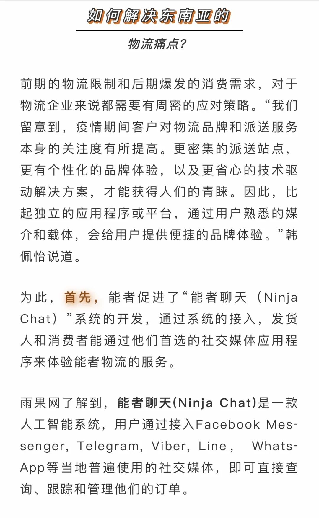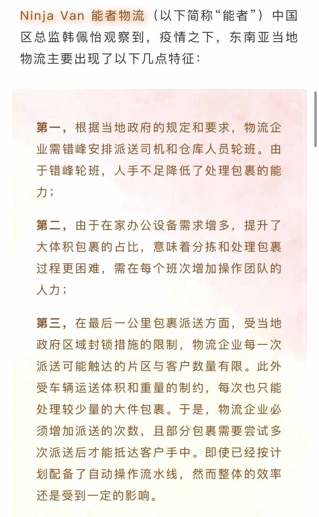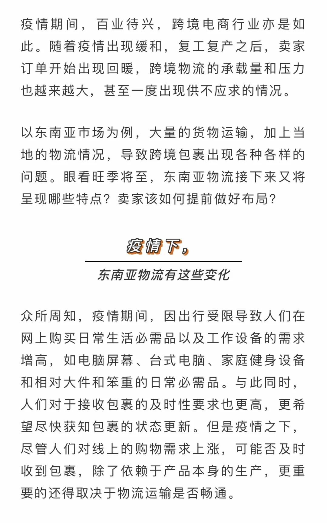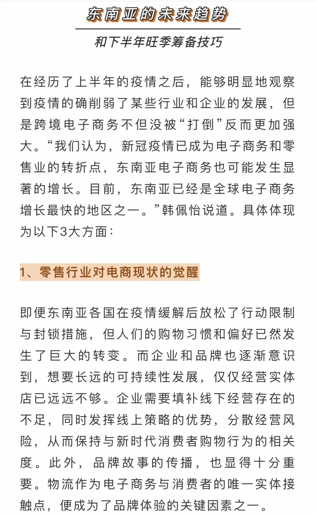 随着疫情的逐渐过去,下半年全球电商消费旺季也即将到来,不管把目光放在哪个市场,电商出海,物流作为卖家与买家的唯一实体接触点,有着举足轻重的作用与影响。 近日,Ninja Van与本地跨境电商资讯平台雨果网分享了疫情之下的东南亚物流现状,分析了市场趋势,并为跨境下半年电商布局当地市场,给出了建议。