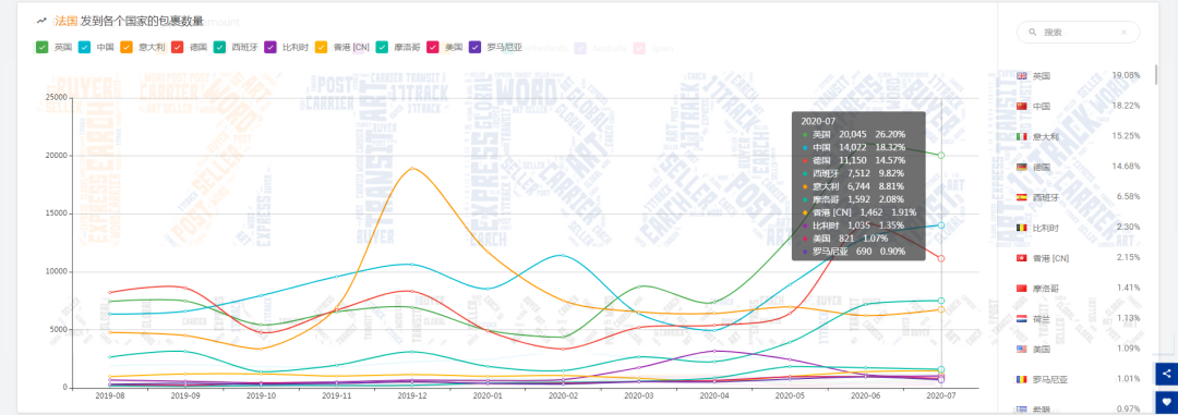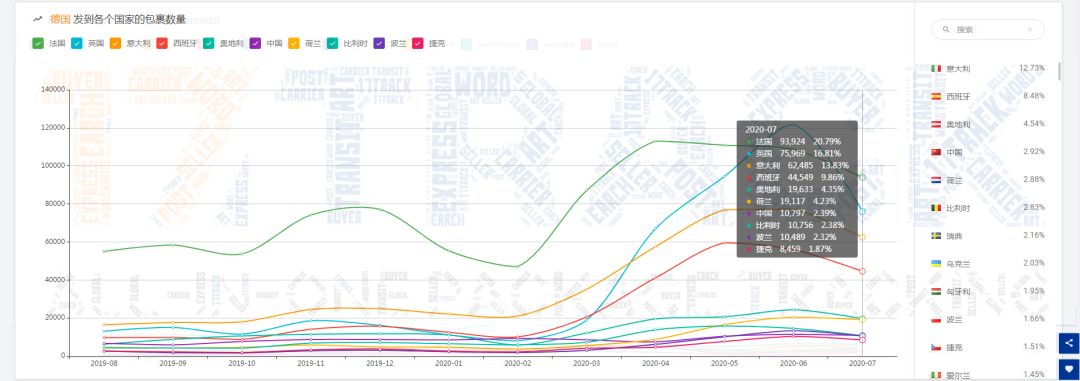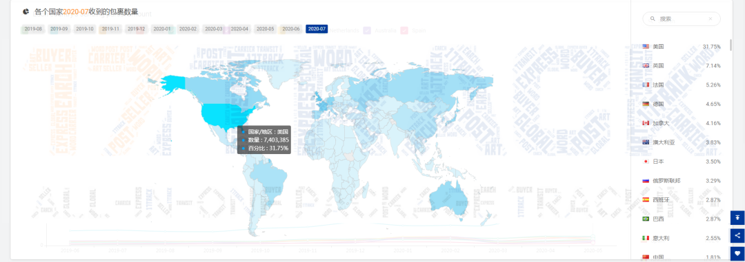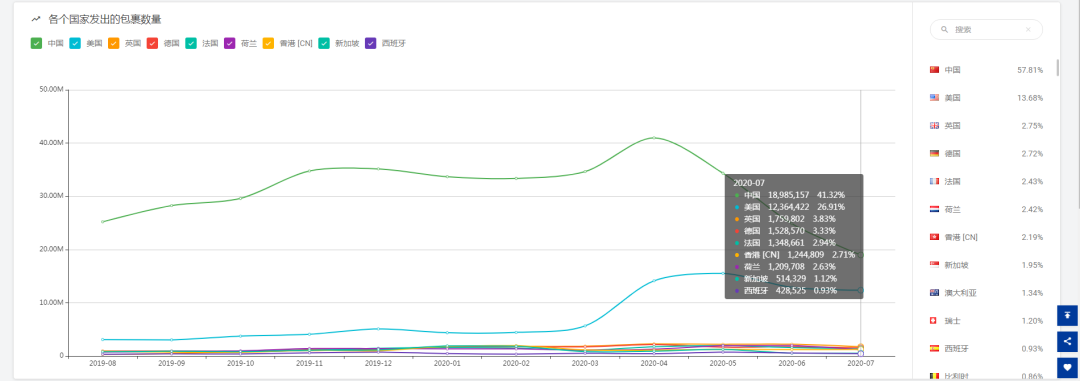 本期咱们回顾一下7月份的包裹数据:环比可以看到,7月份各个国家发出的包裹数量较6月份减少900万、降幅为16.12%,是连续第二个月数量下降;同比略有增长,较去年同期增加400万、涨幅为9.52%;根据Worldometer近期的统计数据,全球累计确诊约2339万例、累计死亡约80万例、其中确诊病例前五个国家分别为美国、巴西、印度、俄罗斯、南非;美国、巴西确诊分别为584万例和358万例;由于全球新冠疫情以及中美贸易争端,导致整个跨境电商、跨境物流仍然存在众多不稳定的因素。