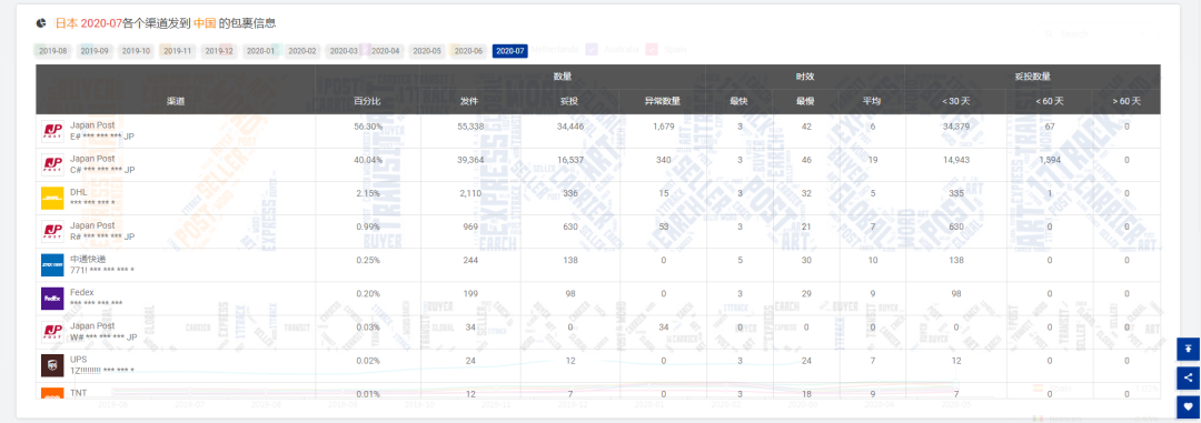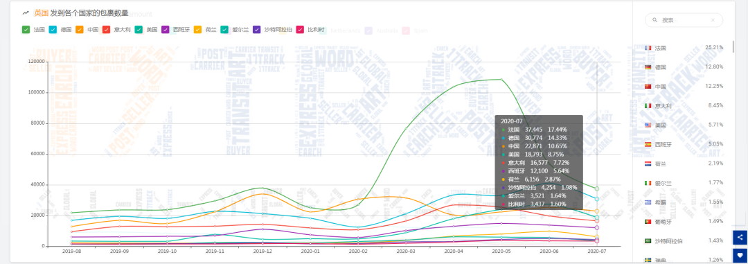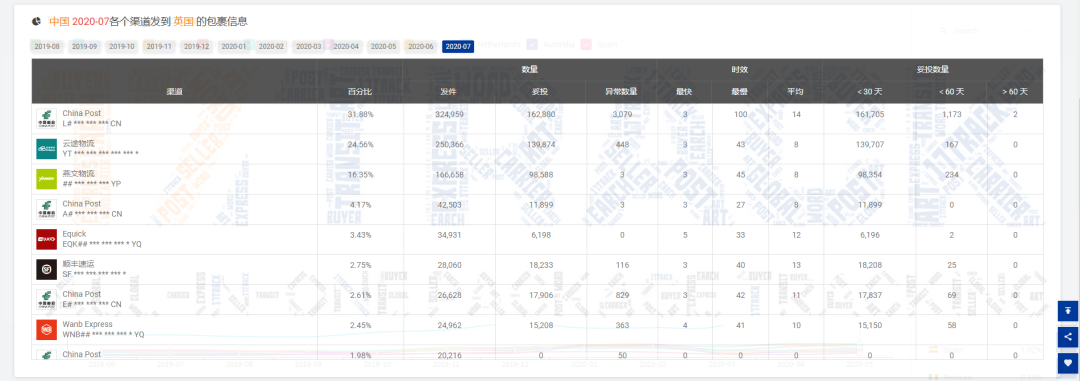 注:中国的邮路渠道占41.32%,占比持续下降,在过去的12个月份中第三次出现占比低于50%(平均为57.81%),而且是历史低位;美国的邮路渠道占26.91%,包裹量虽然有所下降,但占比仍然上升,已经是过去12个月份中的至高位(平均为14.03%);随后分别是英国、德国、法国邮路,另外中国香港、澳大利亚邮路的发件量逆势增长