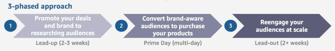 1.Prime Day前的2-3周:向你的潜在客户推广你的品牌和特价活动在Prime Day到来前进行提前的推广营销非常重要,在活动前两到三周的时间内可以向受众推广你的促销产品和品牌理念,加深印象,这将会使你的产品在活动进行期间更容易被发现,增加在活动当天交易的可能。你还可以利用这段时间对广告系列进行优化,例如受众群体和关键字相关策略,让广告能够在Prime Day的投放效果达到最佳。2.Prime Day期间:尽可能接触有品牌意识,更可能购买产品的客户在Prime Day期间,你可以有针对性地增加额外的广告,来最大程度吸引那些已经看过你家广告的受众。比如你可以在Prime Day的前一天向在推广期间访问过你的产品详情页的消费者进行再次营销,以保持消费者在活动当天对自家产品的关注。3. Prime Day后两周:大规模重新吸引顾客,提高转化率!Prime Day2天的活动结束就是结束了吗?大错特错啦!Prime Day赚足的流量就这么放过可太浪费了!收尾收得好,销量还可以继续涨!你可以重新吸引在Prime Day之后仍然访问亚马逊浏览购物的Prime Day受众,并在这个时候对目标受众推广补充商品或者吸引在Prime Day期间未下定决心购买的新受众。