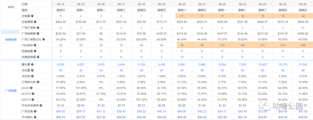 在快要断货的时候,成功补货,我们可以在广告日报上面非常清晰的对比和关注每一产品的多维度的数据情况,以便快速进行判断以及调整。