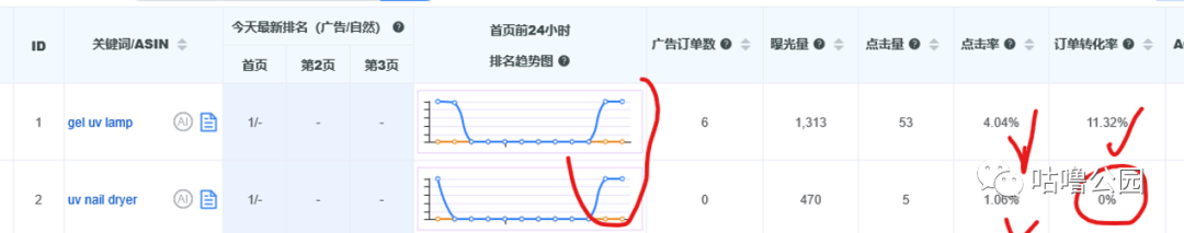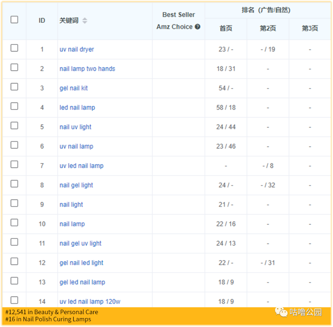 于是我们立刻更换了广告词,我们挑选了搜索量在2万左右、在自动广告期间已经有排名且包含重要词根uv gel nail的两个广告词 gel uv lamp 和uv nail dryer,因为像我们在前文提到的,手动广告会延续自动广告的成果,手动广告起来的速度会更快,挑选的两个词里面,一个是在自动广告中排名在首页第4位,一个排名在第二页第60位。