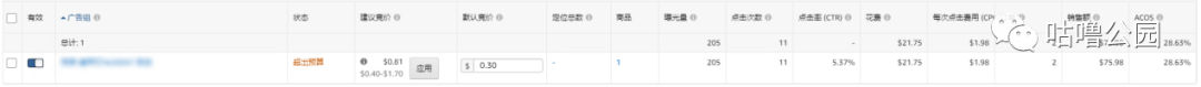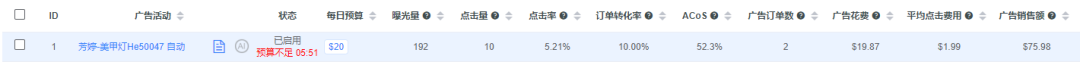 我们可以看到,开了一天的广告,点击率达到了5.37%的高数值,这是因为我们的竞价设置是低竞价高广告位,所以点击率达到了5%以上,高点击率对广告的权重的提升是很重要的。可是同时CPC达到了US$1.98,可是由于广告刚开启需要曝光,所以暂不修改竞价设置。高点击率让我们明确产品的图片、价格等都没有问题,listing引流词也是精准有效的。因此在预算烧完之后,我们及时添加预算,让广告正常继续跑动。